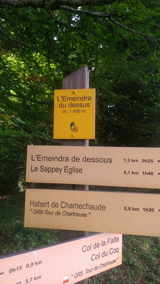 On le fera sur un train tranquille (1h25 – 850m/h). Le sol est souple, ça sent bon les bois, et on avance bien en papotant. Mais j’aurais du prendre mes bâtons ! Le peloton s’est déjà bien étiré. Il y a juste ce qu’il faut de monde pour jouer trouver un bon wagon. Cette première bosse nous permet de profiter de la vue à « l’Emeindra du dessus ». Elle nous offre un joli point de vue sur la prochaine étape : la Chamechaude.